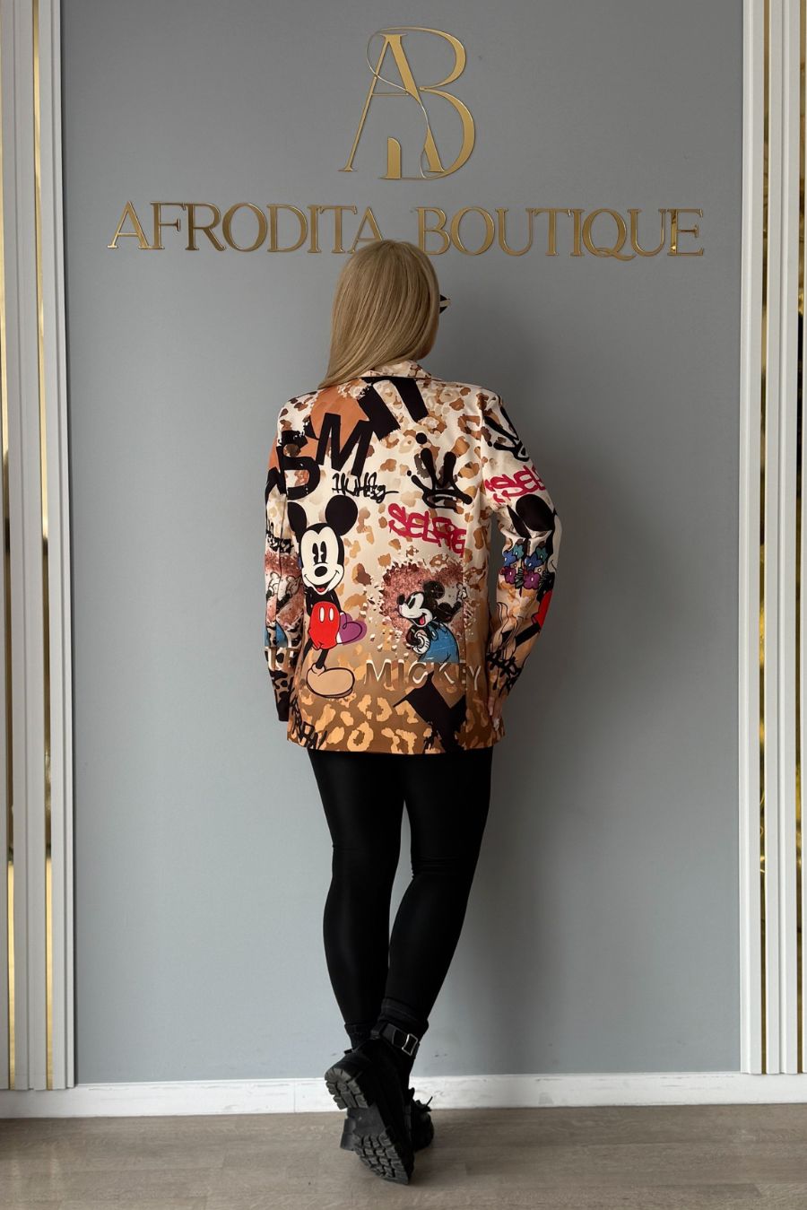 Adaugă un plus de originalitate garderobei tale cu acest sacou cu imprimeu Minnie sau Mickey Mouse, perfect pentru iubitorii de modă care vor să iasă din tipare!
